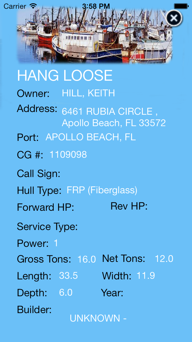 Information includes owner address, type of boat, engine, name, registration date, and address.