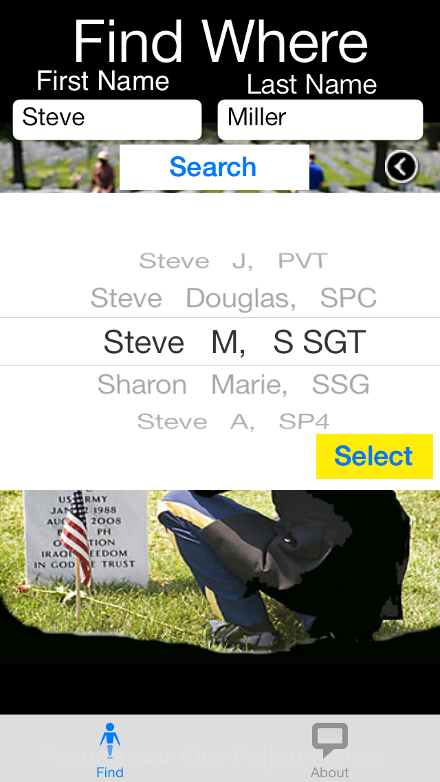 Tap "Search" button to show all matching service records, select individuals with rank to see all details. The Fallen Heros app presents all service men/women whose names match to allow a easy find for common names.